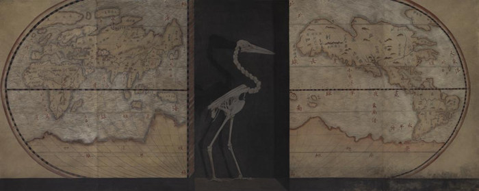 這種自性融洽的緣起,我們能夠在作品《世界的盡頭》中找到線索。徐累自述《世界的盡頭》是其向內自觀求索時期的最后一件作品,中國繪畫中何以見天地?時時在其心頭叩問。而《世界的盡頭》這幅作品,繪制了一具在《坤輿萬國全圖》中長途跋涉的鳥類骨鶻,當文明走向無所適從之所,世界的開端又重現眼前,世界的盡頭抑或是世界的開始。這一知會世界的哲思,延伸了藝術家后期對不同文明和歷史的觀瞻,立足種種復合的關系,我們在循環往復中感知一切。