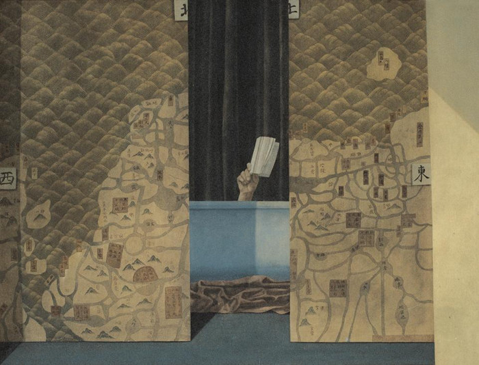 走進展覽的第一單元“前生·時間的定格”,輿圖如屏風一樣向兩邊打開,露出浴缸中持著書卷的手,透過展廳入口旁的圓窗,我們與“時間三體:徐累的藝術”的第一件作品《虛池記》相遇。背景里如同《山海經》般帶著志異色彩的地圖,細看下來,各種交叉相徑的道路和山川,并非以實際的地理名稱標注,而是用蝴蝶譜、古琴名、草藥、詞牌名代替了原有的城鎮、村落與河流,其內容是藝術家想象性的置換。輿圖論據詳實的考證意味被一種復雜而飄渺的浪漫主義消解,而呈現出一類不可求證、不可尋蹤的思維景觀。