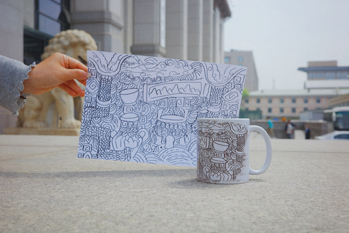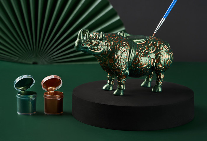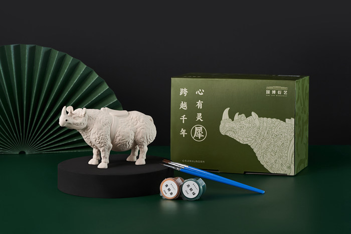 這套心有靈犀DIY陶瓷產品開發的出發點,是為了展現國家博物館收藏重器“錯金銀云紋青銅犀尊”造型和錯金銀紋紋飾的工藝。產品根據文物造型,按比例縮小至長15厘米,高8厘米的陶瓷雕塑;表面紋飾經過簡化,整體還原錯金紋線條。產品工藝上采用素坯燒制,燒制溫度達到1200度,保證了產品的硬度。