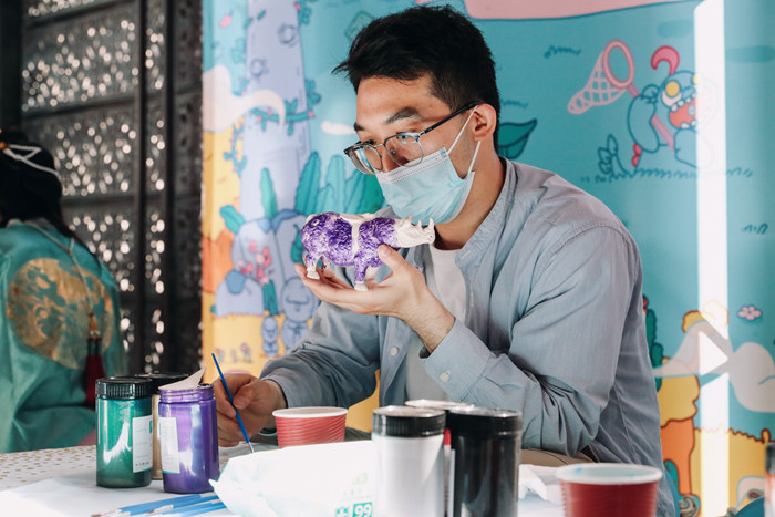 體驗活動寓教于樂。參與者取到犀牛尊模型之后,先用平頭畫筆根據自己的喜好涂抹于犀牛尊全身,等顏料干燥之后,再用尖頭筆將模型的紋飾勾勒出即可。