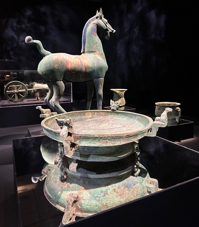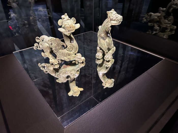 除此之外,鏡子還緩解了展廳中偏暗的燈光:為了營造戲劇化和神秘感,有許多幕展室中缺乏均衡的燈光。聚光燈大多來自天花板的位置,這種情況難免造成一些器物底部偏暗,而鏡子正好彌補了這個缺憾。