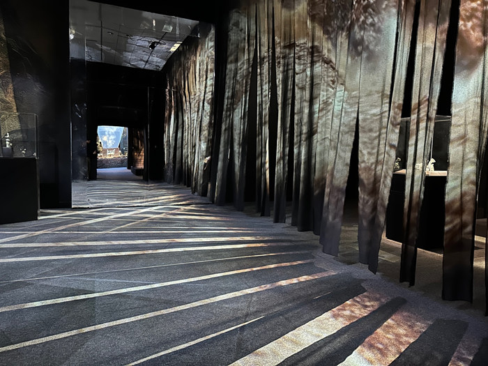 葉錦添先生的設計,巧妙地利用了這條中軸線,實現了各幕既獨立又關聯的脈絡。在視覺上,觀眾站在中軸線的一頭,能看到各個展室的一點點場景,讓人想起蘇州園林那種近景遠景的層次:“庭院深深深幾許,簾幕無重數”,景致并非一覽無余地一次展現,毋寧,它們從遠處給人一些挑逗,然后移步換景,逐次展露。