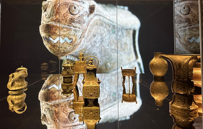 給展覽錦上添花的是,中軸線右側盡頭靠墻而立的那一面巨大鏡子,由于鏡子正對著那條長長的、串起5個展室的過道,鏡中的幻象將中軸線和沿線的景致擴大了一倍;觀眾站在鏡子前,左看右顧都是都是看似無盡頭的場景,以及包孕在這些場景及其轉換中的歷史和青銅器文化。