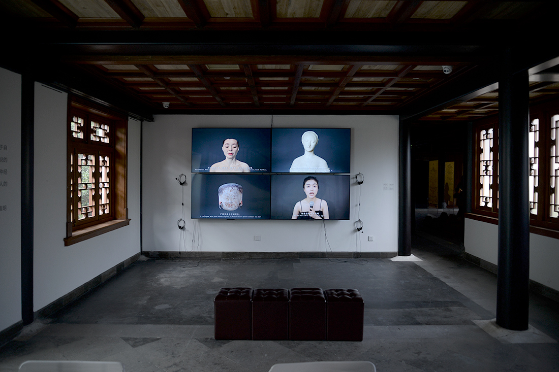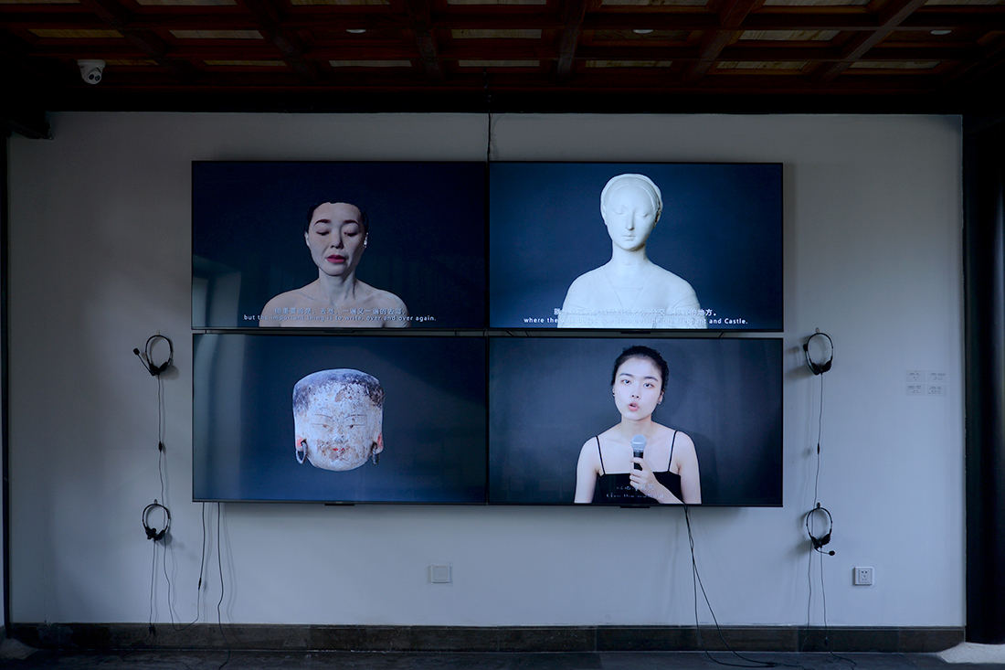 《講故事的人》。沿著樓梯從二樓展廳回到一樓,彭薇講述的故事在展廳西側的四屏影像作品《講故事的人》進入尾聲。在現實世界里,代表過去的伍爾夫、蔡文姬和今天的彭薇、脫口秀演員淡淡糊講述各自的故事。