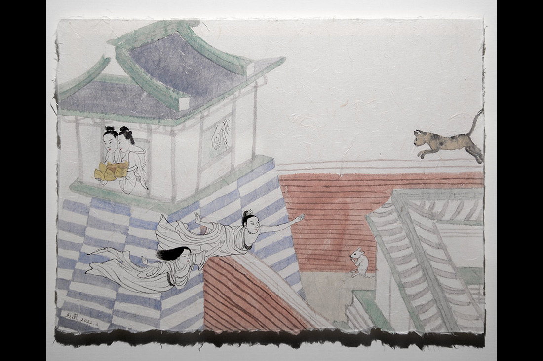 《節日》系列,彭薇,每幅140×70cm,紙本設色,2022-2023。進入一層展廳首先看到五張《節日》系列作品屏風式排列,模仿古代影壁,使這組作品的呈現形式形成傳統建筑的中堂格局,且具有裝飾性與莊重感?!豆澣铡废盗惺苌显?、中秋節、乞巧節、盂蘭盆節等節日傳說啟發,講述院落中,人們在特殊時刻共處同一空間,不同的遭遇和感受。