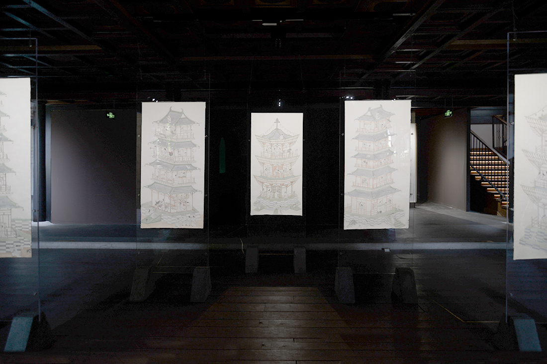 《回廊》系列,彭薇,每幅60×180cm,紙本設色,2022。二層的《回廊》系列采用雙面吊裝,模仿傳統中國畫的裝裱方式,使觀眾穿行其中,由此一窺藝術家內心深處的另一面。
