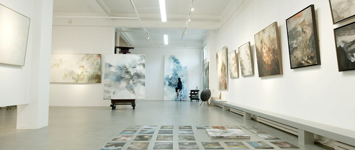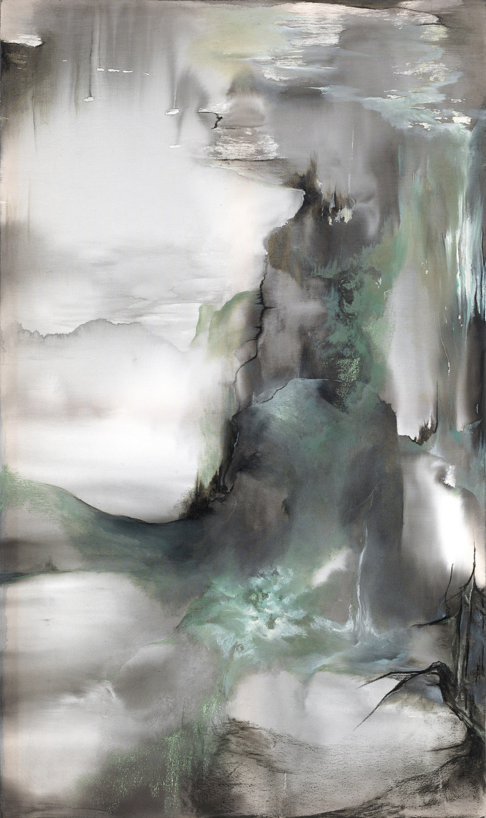 在繪畫創作中,張蒙不太習慣用材料給作品下定義,油畫、水墨畫或是色粉畫,在她看來這些只是表達的一個媒介和材料,而不是一個限制。她在工作臺上會放各種材料,一幅畫面里,嘗試將水墨的溫潤、油畫的細膩、色粉的顆粒感相融合,有時出來的效果出其不意。她喜歡創作過程中無目的、自由的感覺,結果也常常朝著偶然的無意識的走向。張蒙試圖以現代方法表現東方美學的可能性,在傳統山水畫和當代藝術實踐之間把握一種平衡。對張蒙來說,繪畫不是純感性的表現,在生發的過程中,它既包含感性又顯現出理性與克制的相融。