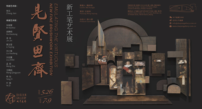 2023年5月27日下午,展覽“見賢思齊:新工筆藝術展”在大千畫廊正式開幕。展覽由美術學博士、中國美術館研究館員魏祥奇擔綱策展,展出包括中國藝術研究院工筆畫院院長張見和他工作室的青年藝術家葉紫、孟哲、劉志蕾、畢曉慧、王晴園、金金、栗玉瑩、楊怡、劉小鋒、胡簫桐共同創作的工筆繪畫裝置《當<夜巡>來到中國》等在內的作品20余件。
