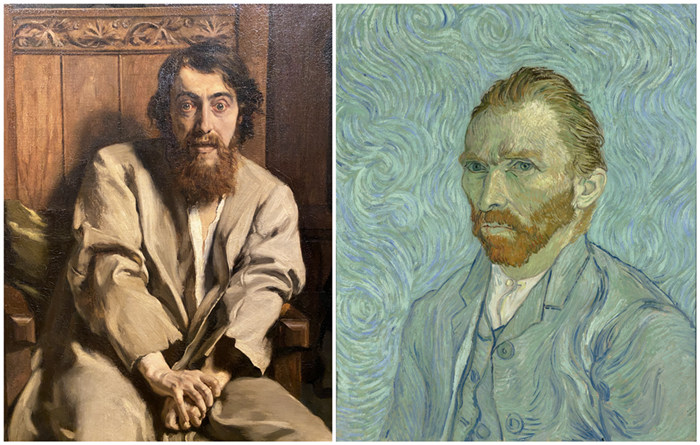 將梵高的自畫像與沃特斯所描繪的古斯放在一起看,便不難理解梵高為何會將自己的容貌神態與古斯并論。梵高的這幅自畫像創作于他最后的日子,是他在圣保羅精神病院完成的。他說自己內心的一方面如古斯一樣是個尋求平靜的修道士,另一方面也和古斯一樣是個瘋狂的藝術家:“卡在這兩者之間我并沒有太郁悶,因為你必須去生活?!敝皇遣痪煤?,梵高如古斯一樣,選擇結束自己的生命。