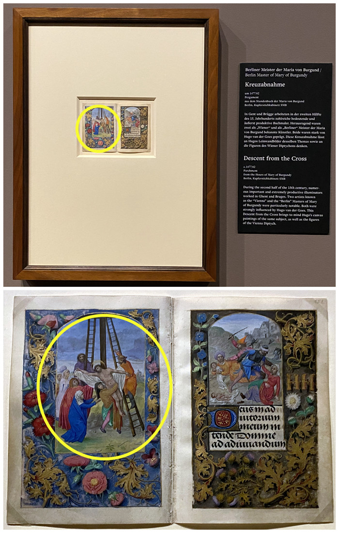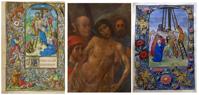 “卸下圣體”,左圖*:勃艮第的瑪麗大師(Vienna Master of Mary of Burgundy),約1470/80,美國洛杉磯蓋蒂中心藏品(Getty Center);中圖:雨果?凡?德?古斯,約1480;右圖:勃艮第的瑪麗大師(Berlin Master of Mary of Burgundy),約1477/82,羊皮紙,德國柏林國家博物館之版畫素描博物館藏品