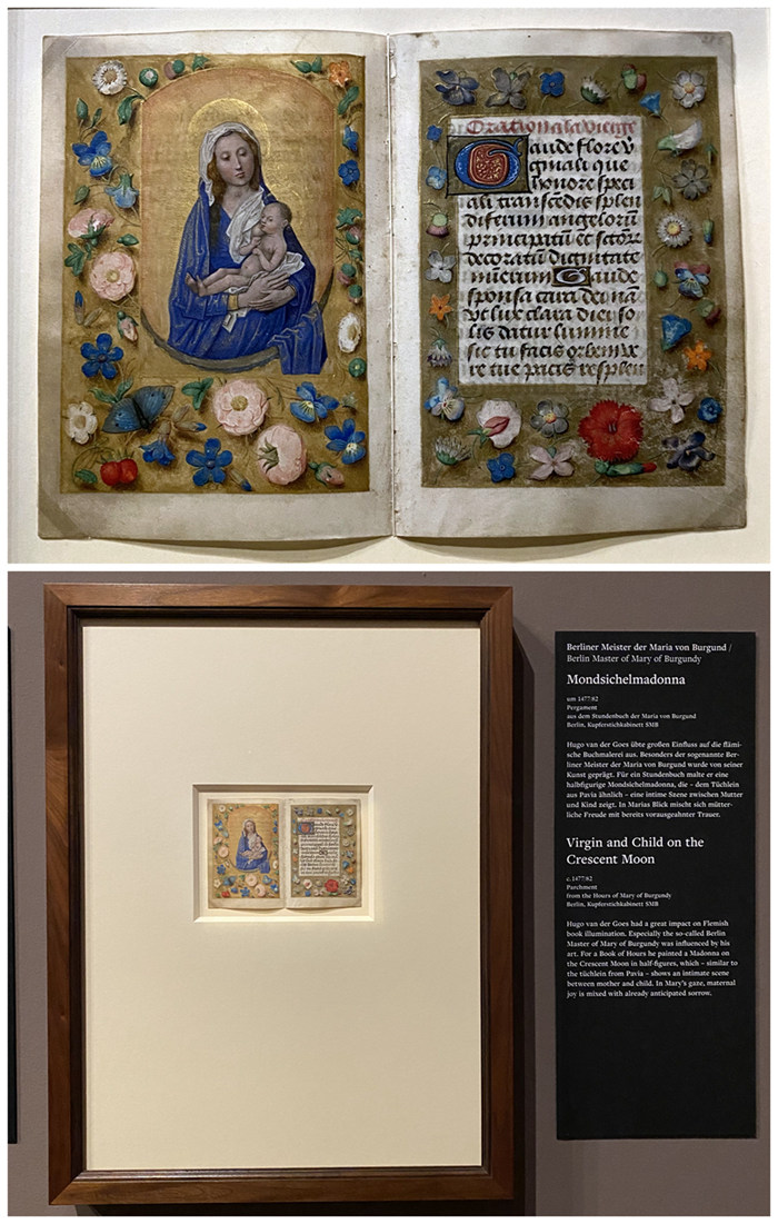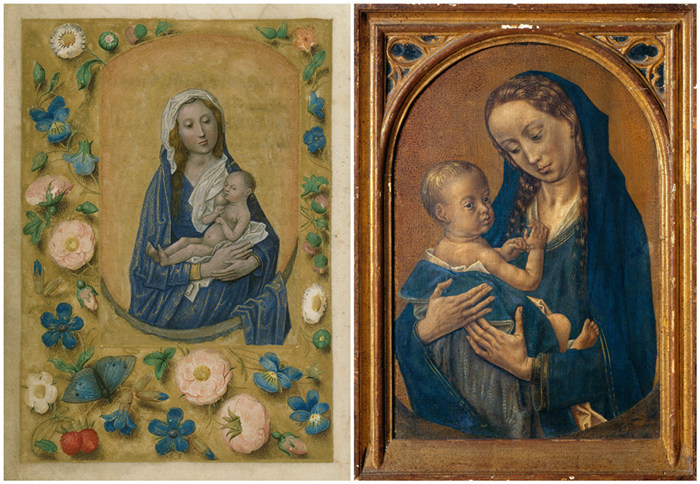 “圣母子”(Virgin and Child on the Crescent Moon),左圖:勃艮第的瑪麗大師(Berlin Master of Mary of Burgundy),約1477/82,德國柏林國家博物館之版畫素描博物館藏品;右圖:雨果·凡·德·古斯,1476年之后,意大利維斯孔蒂城堡藏品(Musei Civici di Paiva)