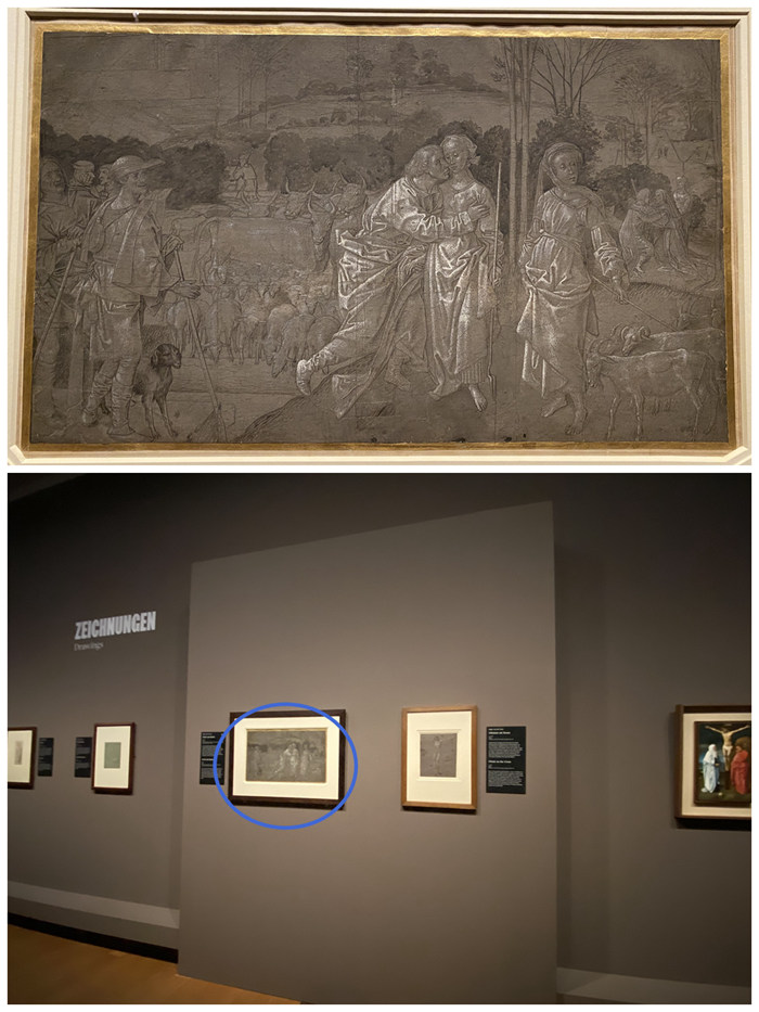 然而現場最令人感到驚喜的是古斯的素描作品,當今只有兩幅被認為完全出自古斯之手的素描作品全部來到了展覽現場,牛津大學出借的這幅《雅各與拉結》是15世紀尼德蘭繪畫的代表作。為了更接近肉眼所視效果,此處就放現場實拍圖了(雖然實在難以拍出它的美貌)。
