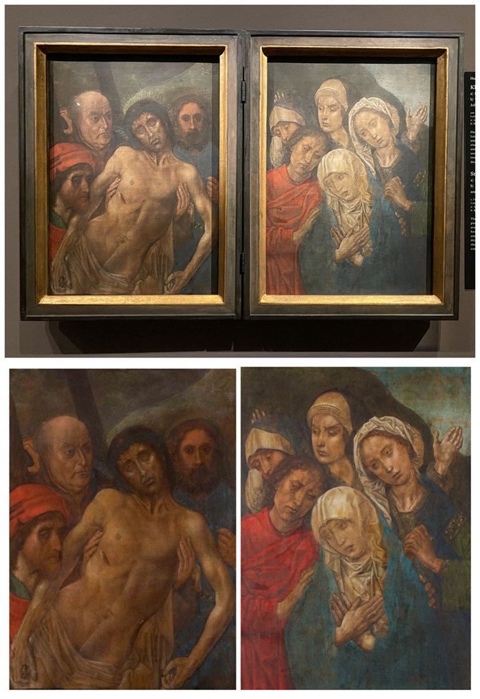 “卸下圣體(小型)”(Small Descent from the Cross),雨果·凡·德·古斯,約1480。上圖:柏林展覽現場實拍;左下:“左幅:卸下圣體”(Deposition of Christ),比利時安特衛普菲布斯基金會藏品(Antwerp,The Phoebus Foundation);右下:“右幅:四個哀悼的女人”(Four Mourning Women),柏林畫廊藏品