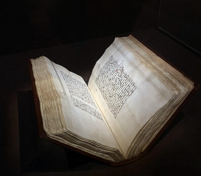 展覽現場有一本特殊的“傳記”,1475年,19歲的加斯帕·奧夫伊斯進入魯德克魯斯特修道院成為僧侶,在古斯離世后,奧夫伊斯在撰寫修道院編年史時寫下他對古斯的回憶,就此成為古斯最為早期的生平記錄之一。