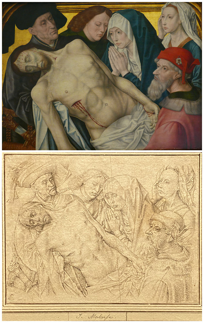 “卸下圣體(大版)”(Large Descent from the Cross),上圖:佚名復制品,約1500/20,意大利那不勒斯國立卡波迪蒙特博物館(Museo e Real Bosco di Capodimonte);下圖:雨果·凡·德·古斯的佚名追隨者,約1500,素描,奧地利維也納阿爾貝蒂娜博物館(Vienna,Albertina)