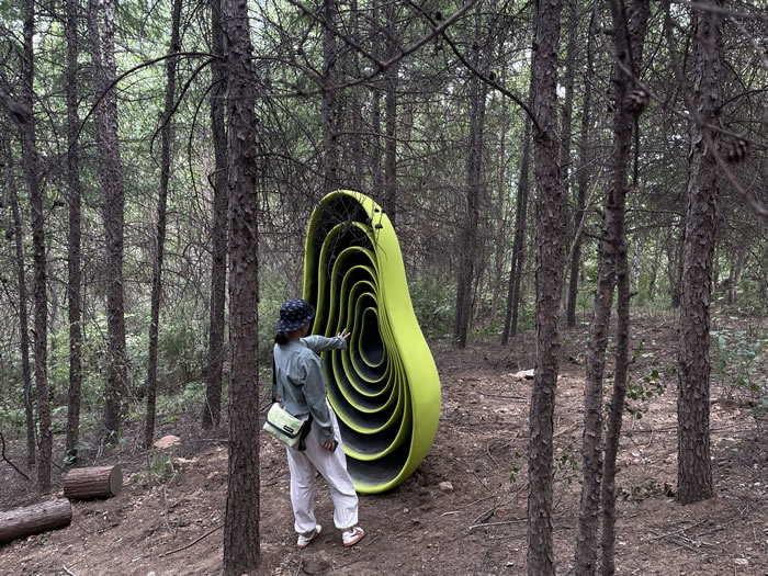 山林間的漫步是逃離酷夏的最佳路徑。阿那亞的林間信步路線中,隱藏著許多有趣的作品等待你的發現。走著走著,林間驚現一巨大的“牛油果”,這是娜布其從陳思安短篇小說《我們》中獲取靈感創作的同名作品。這里的“我們”并不是“我”和其他人構成的集體,而是無數層“我”的集合體。這些“我”就像一個個套娃,又宛若一層層的洋蔥,剝開一層又一層,每一層的“我”都耐人尋味,也構建了觀者與作品,觀者與自身,觀者與自然的思考關系。