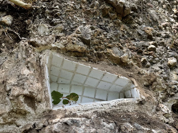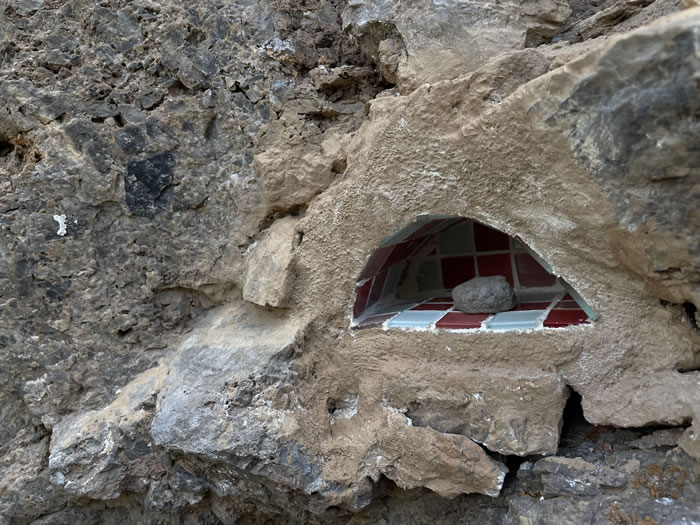 越過這段長城殘垣,便是下山路。在這條路上,徙步如同“探寶”:藝術家梁碩留給游人一道“謎題”——他將六件作品藏在路途之中,仿佛在有意與觀者捉迷藏一樣,為徒步憑添了一絲期待與樂趣。這組作品叫《小家》,梁碩受金山嶺“老道洞”的啟發,在徒步過程中打造出六個“小洞穴”,用瓷磚貼在其內壁進行裝飾,彩色的瓷磚給人一種家的感覺,藝術家通過將這種工業而普遍的材料嵌入洞穴的方式,探討人與空間,人與自然之間的關系。這些“小家”本來是空著的,小編路過便拾起它周圍的花草石塊放置其中,希望也為這些“小家”添置些生氣,有趣的是,隨后我竟然在朋友圈發現有更多的人也跟隨著往里面放入石子和草木,就讓它們繼續“生長”下去吧~