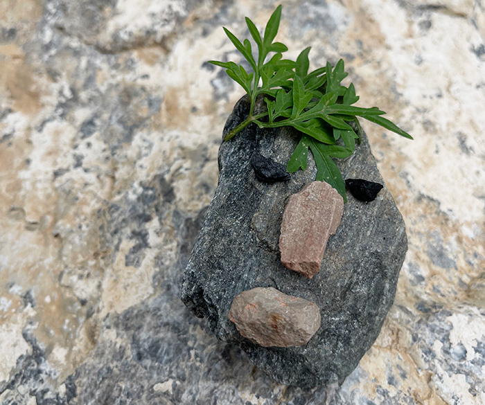普林茨·古拉姆是一個由沃爾夫岡·普林茨(Wolfgang Prinz)和米歇爾·古拉姆(Michel Gholam)兩位藝術家組成的二人組合。兩人于2001年起以“普林茨·古拉姆”一名開始聯合創作,他們合作開發了一種基于表演和協作過程的藝術實踐。他們于2017年開始創作《石面》系列,在各地拾撿有趣的小石頭,也搜集一些建筑工地的工業遺存,并將它們拼湊成一個個千姿百態的“面孔”,通過取材自然的“人臉”反映人與自然的關系。他們的作品生動可愛,古拙稚趣,讓人禁不住也跟著模仿起來,上圖就是小編照葫蘆畫瓢拼湊的一件,大家不妨一起來加入其中,也許在山谷的其他地方,也找到有趣的石面哦~
