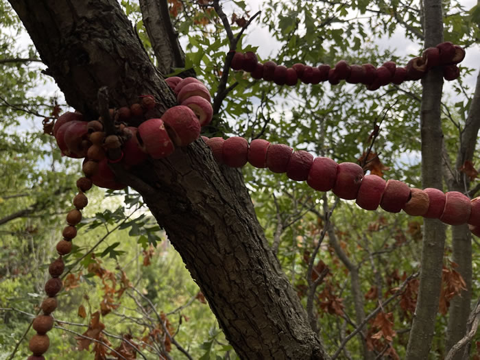 在另一段山路中,王一一的作品《紅果》令人印象深刻:藝術家收集金山嶺當地盛產的原生山楂,選取4種山楂共計10萬余顆穿起了總長2公里的裝置藝術作品,而在這一勞作中,王一一把當地居民納入其中,邀請他們共同參與其中,以社區共創的方式完成了最終的作品?;鸺t的山楂錯落交織在山林之中,明艷而芳香,在日曬雨打或是動物的啄食下作品將經歷另一番變化,而這份因自然而引發的不確定性也將被納入作品的一部分。