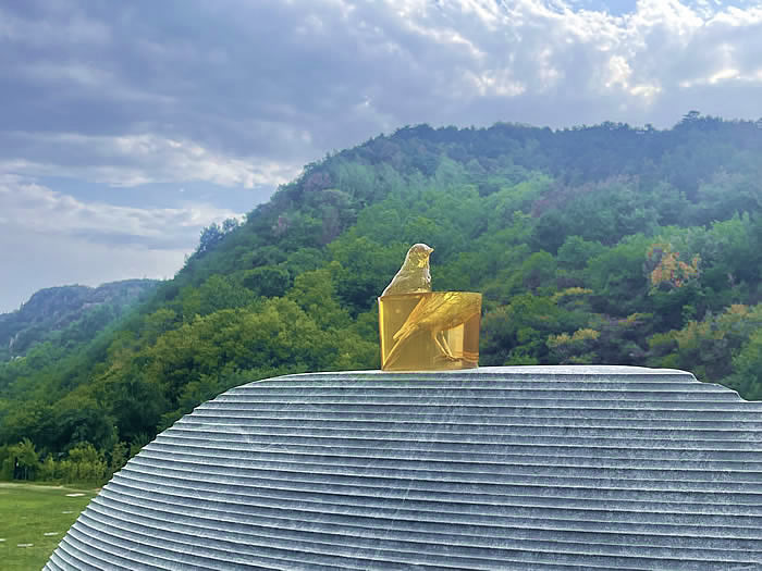 “邊界/分界線”是本次大地藝術節的一個重要話題,不論是人與人的邊界感,還是國與國的領土劃分,都令人敏感。而在藝術家看來,自然世界對人類驅動的敘事和結構一無所知,正如灰背赤腹鶇這樣的候鳥,它們不受人類強加的邊界的限制,自由往返飛越山脈、城市和邊界。因此,藝術家以棲息在朝鮮半島的候鳥為創作對象,用3D打印的透明模型將其水平分成上下兩部分,下半部分成為一個容器的形狀,可以存蓄雨水,作為鳥類的飲水或浴池空間,集藝術性、概念性與實用性為一體。