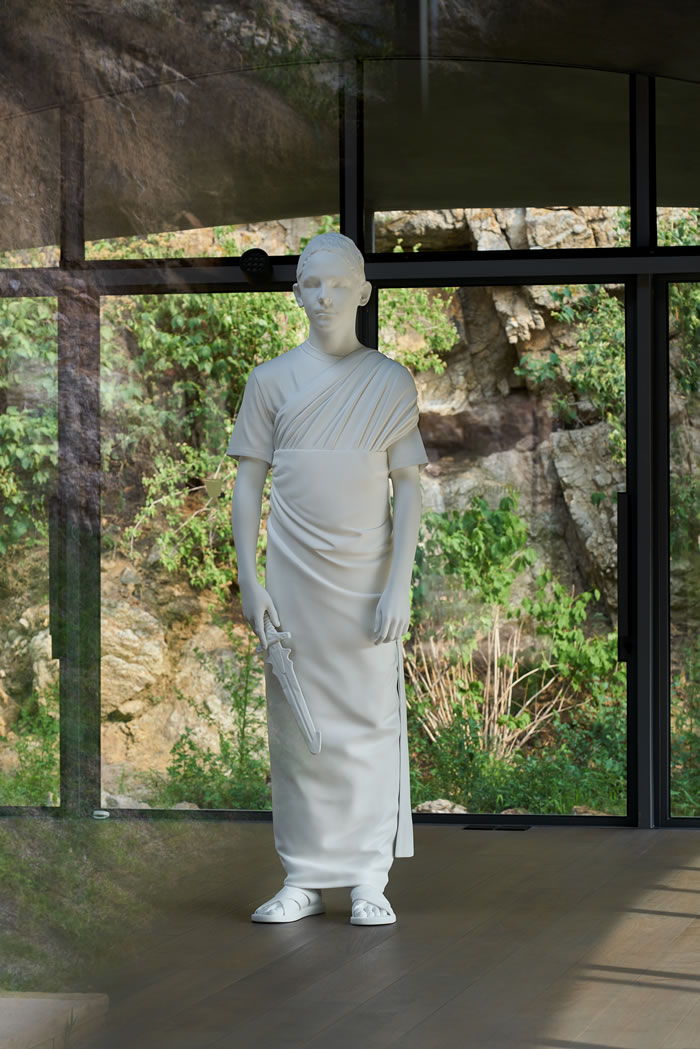 佇立于上院的這座雕像出自查爾斯·雷之手,這位藝術家的作品曾在卡塞爾文獻展、三次威尼斯雙年展和六次惠特尼雙年展上展出,圍繞他的雕塑作品曾舉辦五次回顧展,可謂“重量級選手”。 這座近兩米高的雕塑刻畫了一位正在表演劇目的13歲學生,他身披床單改制成的羅馬長袍,模仿著羅馬軍官的樣子,但手中的玩具劍又暴露了他的稚嫩。藝術家將當代藝術與古希臘范式相融合,留大片想象空間給觀眾獨自體味。