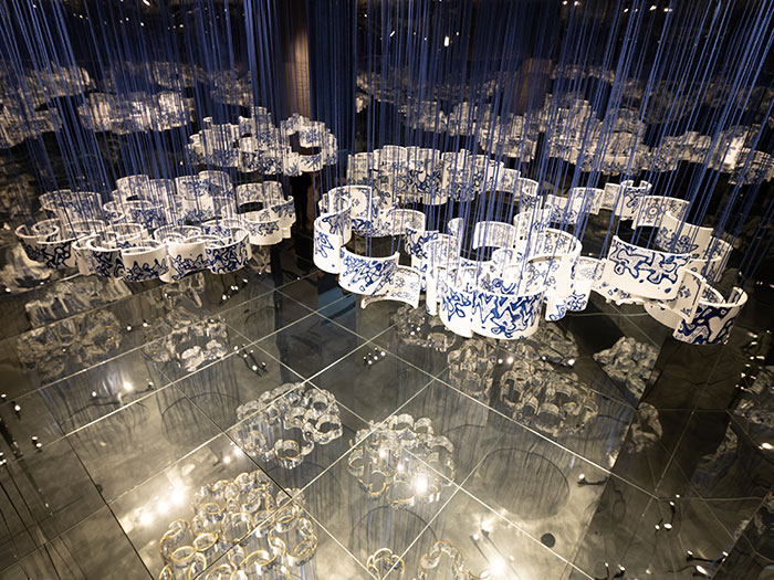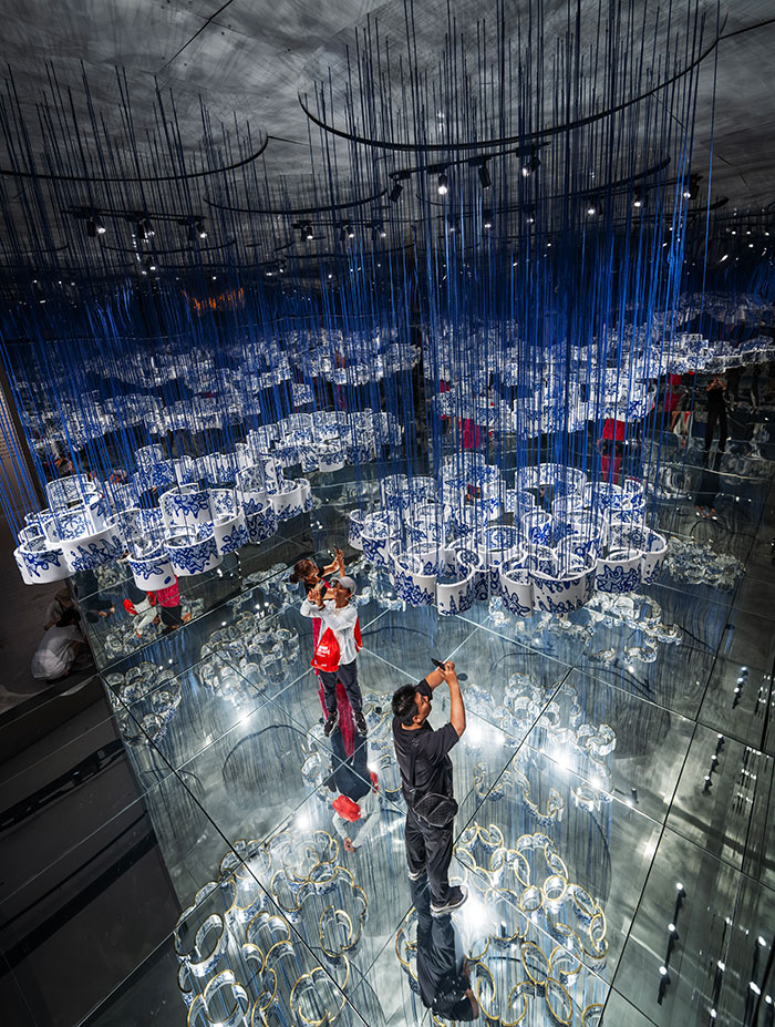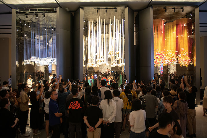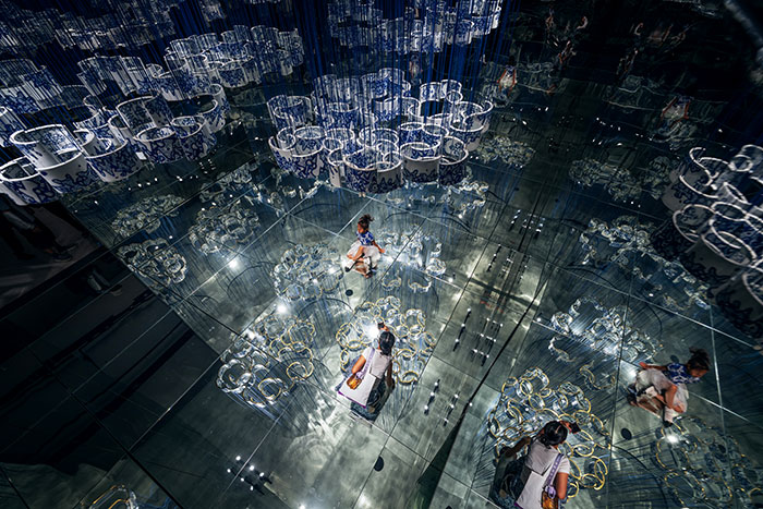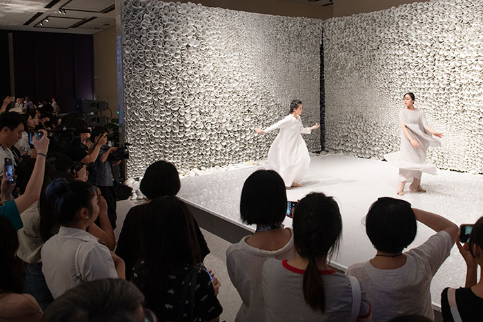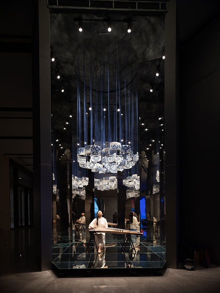 開幕式現場,觀眾置身這些風格與情景各異的陶瓷裝置藝術場景空間中,中國器樂演奏和舞蹈表演將藝術空間激活,并加入全新的藝術語匯,在視覺與聽覺藝術的交融碰撞中誕生了深具中國式美學意味的“藝術場景流”。演奏者與舞者傾情表演的同時,觀眾們紛紛駐足,沉浸于或悠揚或舒展的藝術表演中,體驗著中國式視聽藝術場景的意境之美,特別是觀眾在欣賞《花的精神》場景中的表演時,通過表演者身后的鏡面,觀眾們的身影也融入到該藝術場景中。由此,作品、演者、觀者之間合力構建了一個綜合形態的審美空間。