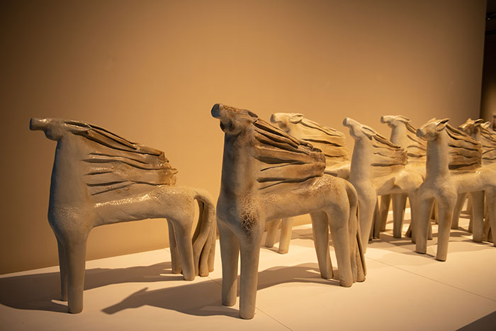 本展覽的第二展區為文獻展,展出朱樂耕從20世紀80年代起各階段的代表性陶藝器皿、雕塑、繪畫等作品,如《風箏》《苗家風情》《風》《行空的天馬》等,反映了朱樂耕四十余年陶藝創作的發展歷程。這既是個人的歷程,從某種角度而言也反映了中國現代陶藝發展的某個側面。