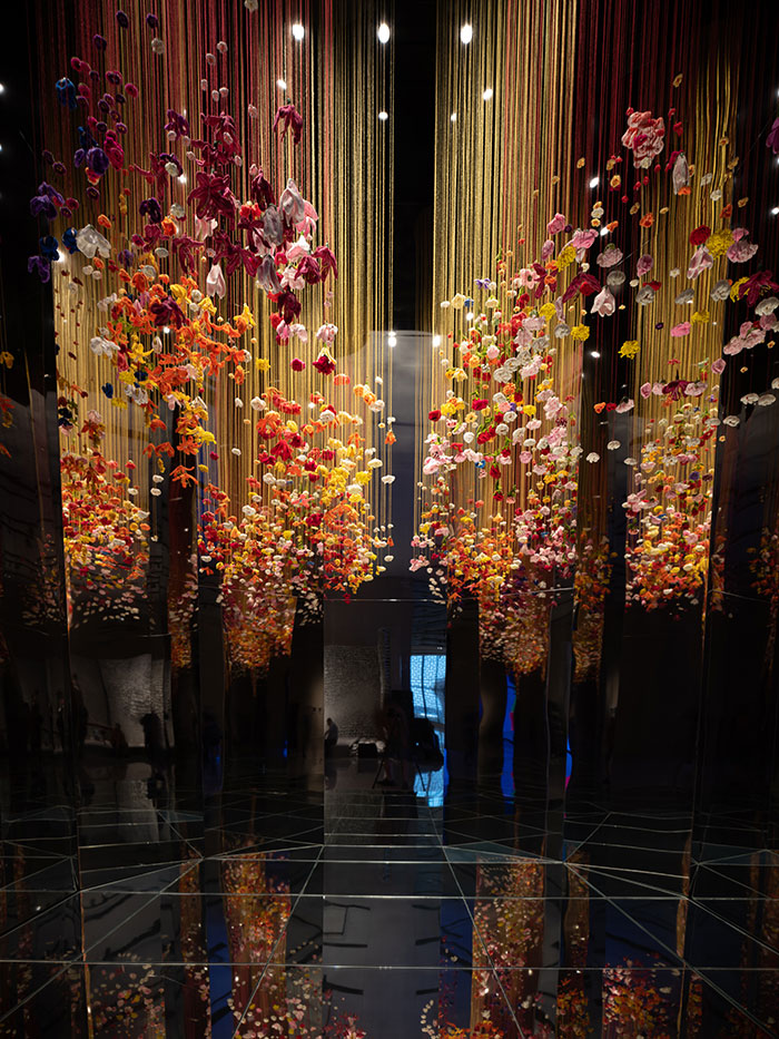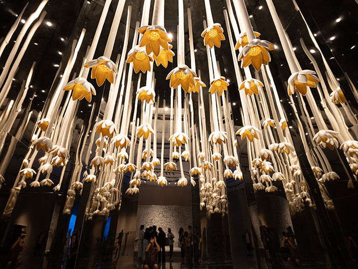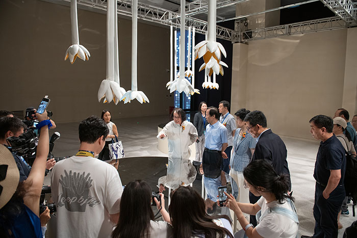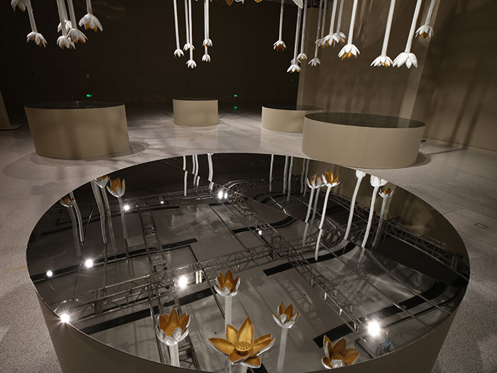 本次展覽共分為兩個區域,第一展區展出朱樂耕“藝術場景”系列作品:《生命之盒》《花的三重境》《蓮之鏡像》《花的精神》《荷·蓮·韻》。這些作品創造性地為觀眾、表演者、互動者提供了可參與可進入的以現代裝置建構成的藝術場景空間。這是在新技術與新審美需求的碰撞中催生的藝術新物種,也是對中國式場景藝術的一種嘗試。在這些互動場景藝術空間中,人與藝術的關系被重新塑造。展覽以極富想象力的未來圖景驅動藝術家和觀者們的創新意志,也重新建立了創作者與觀賞者之間的關系,并試圖建構一種藝術創作與藝術進化的新范式。