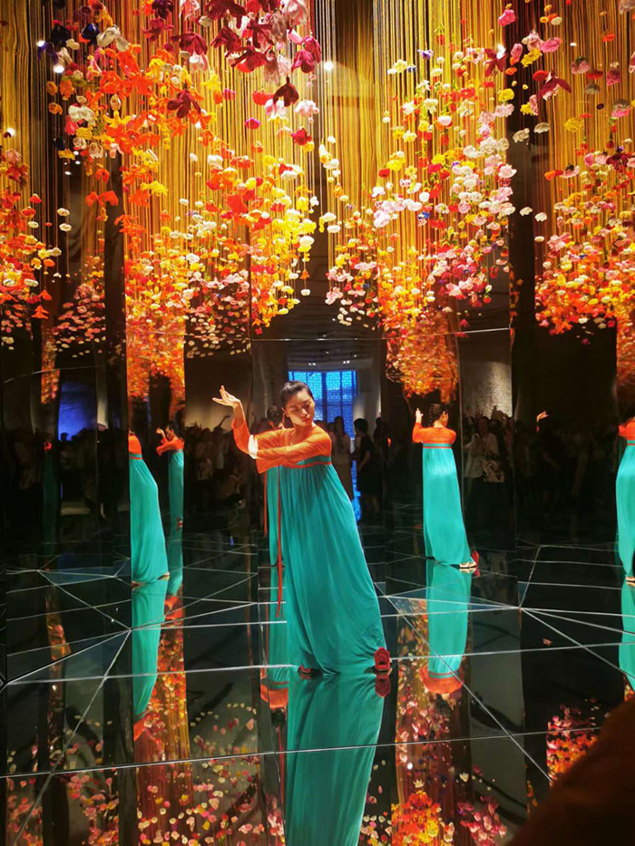 《花的精神》由三個藝術場景空間組成,在其中的《絨之百花·春之鏡像》空間里繽紛垂落的絨線花束與《蓮之鏡像》中垂落的陶瓷蓮花下,兩位舞者同時上演了雙獨舞作品《俑Ⅲ-唐樂宮圖》。此段舞蹈由北京舞蹈學院田湉編舞,取材于中國古代歷史名畫,不同的空間造型和近距離欣賞的觀感給觀眾帶來與劇院大舞臺中欣賞舞劇完全不同的感受。