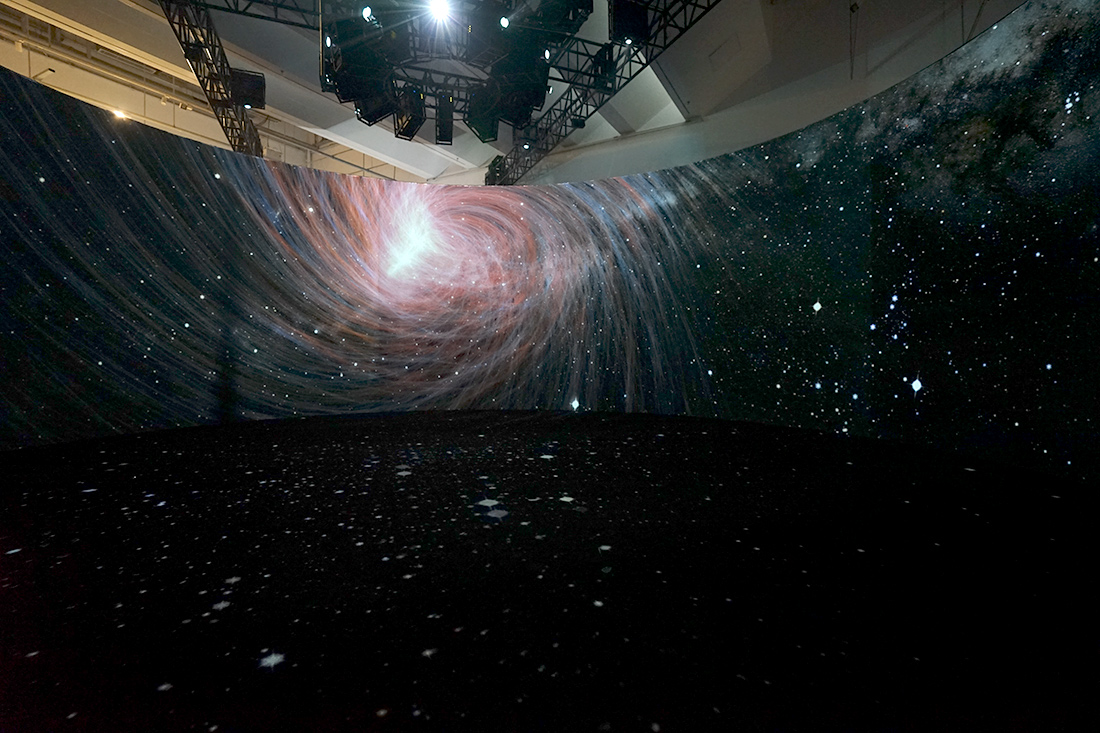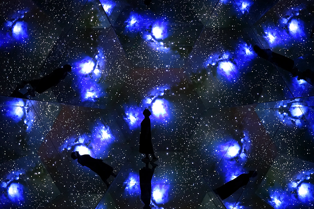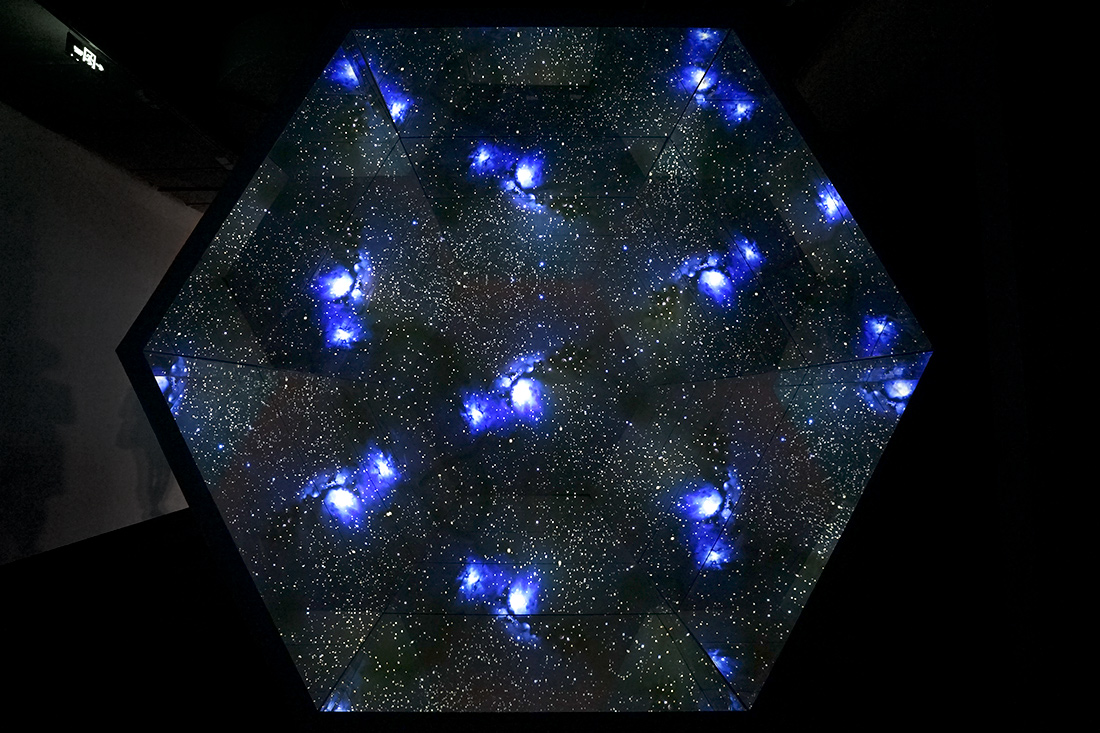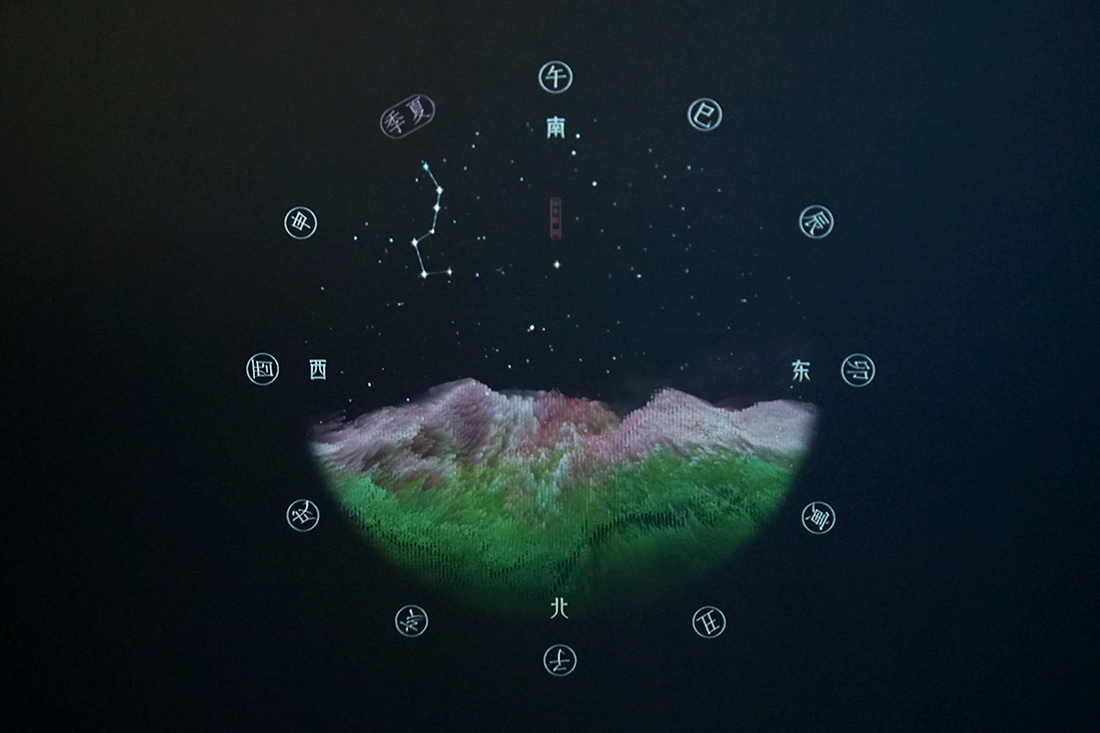 《天體樂章》,安久、李昊哲、錢正吳。太空之上,星月交輝??缃缢囆g家展現出他們波瀾壯闊、恣意浪漫的想象力。數字互動影像裝置《天體樂章》由安久聯合技術藝術家李昊哲和音樂制作人錢正昊共同創作,讓星體的位置關系、明暗變化、化學構成變得可視、可聽,將天文和步天歌的浪漫有機結合起來。(攝影:蘭紅超)