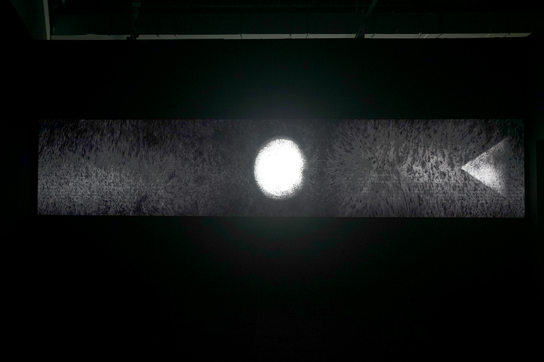 《軌道》,Quadrature,2023。朱利安·戈茨和塞巴斯蒂安·尼特的作品《軌道》則展示了衛星和太空垃圾圍繞我們旋轉時的詩意舞蹈??此苹靵y的路徑變異為有機的視覺模式,背后實則是物理規律的產物。(攝影:蘭紅超)