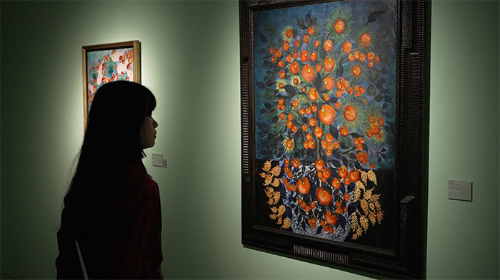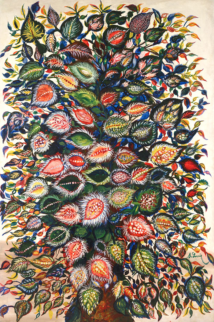此次稚拙派展覽中,還有許多關于花卉的創作。最常描繪花卉的女性代表藝術家薩賀芬·路易斯,她用植物締造了一個完整的藝術世界。比如,絲線般細長的雛菊花瓣、嫁接在棕櫚樹樹干上的葡萄串,這些元素都在她的作品中耀眼奪目。而出身園丁的藝術家鮑尚在他的作品中集結了各種動植物,并用出人意料的背景加以襯托,給日常的景象平添了異域的情調。