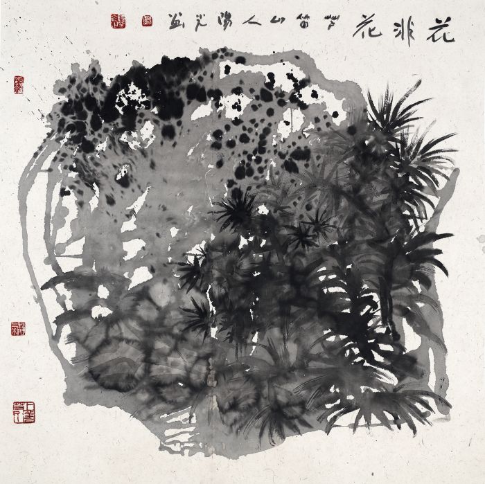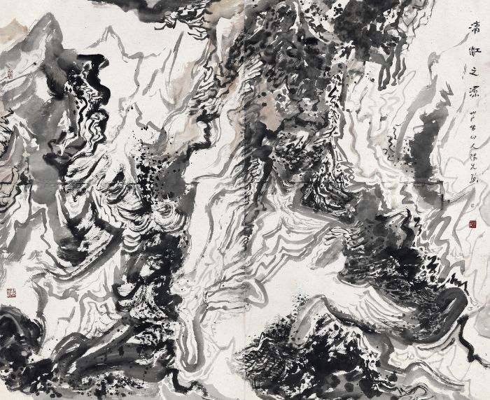總體而言,陽光所聚焦漓江的山石、花草樹木,通過潑墨加皴擦點染、濃淡相破的技法,保留作畫過程中的偶然性因素,畫面布局吸收現代構成的表現方式,同時保留中國畫的筆墨語言,力求一種中西融合的水墨畫新氣象。在這其中,他所用到的技法是潑墨——水破墨或者墨破水,特別是在大幅作品中撞水、撞墨、撞彩,升華筆墨的美感,從而達到具有沖擊力的視覺效果,這需要大破大立的勇氣。