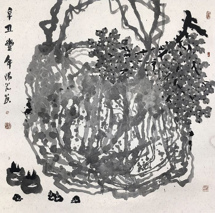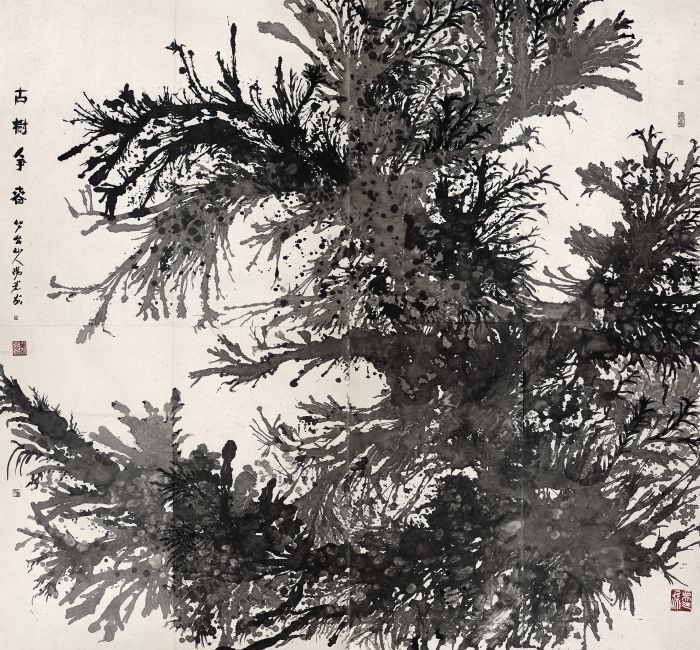 陽光的“古樹”系列作品,純水墨、不著色,滿紙老干嫩枝、藤蔓纏繞,原有的山水那種“蘆笛逸清音”般的印象,在這里變為重如沉雷般渾茫與浩思。在創作中,陽光將干濕濃淡自由揮寫,爾后用墨點苔痕,用水沖撞,勾寫與潑染結合,透出“筆暈墨章”的華滋——以古樹為代表,進一步呈現出山非山、樹非樹、石非石、花非花的物象表達,構成了具有現代性的語言圖式——陽光畫的不是漓江所見到的某種樹的品種和外形,而是呈現漓江兩岸古樹的總體精神和氣質,所以稱之為“古樹之氣”,也是時代之氣。
