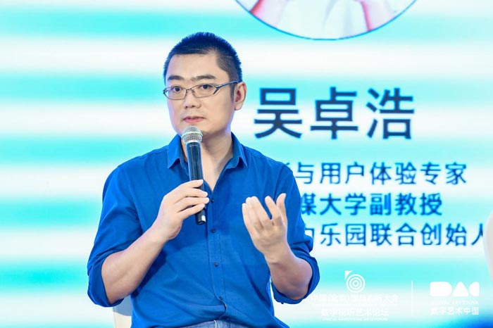 他還以首都博物館輝煌中軸大展和蘇州灣數字藝術館策展設計實踐為例,從“虛實共生的中國式元宇宙場景構建”、“文化遺產數字藝術化與具身體驗設計”和“建構一個數字藝術美學體系”這三個維度深度暢想了未來視聽藝術的邊界。