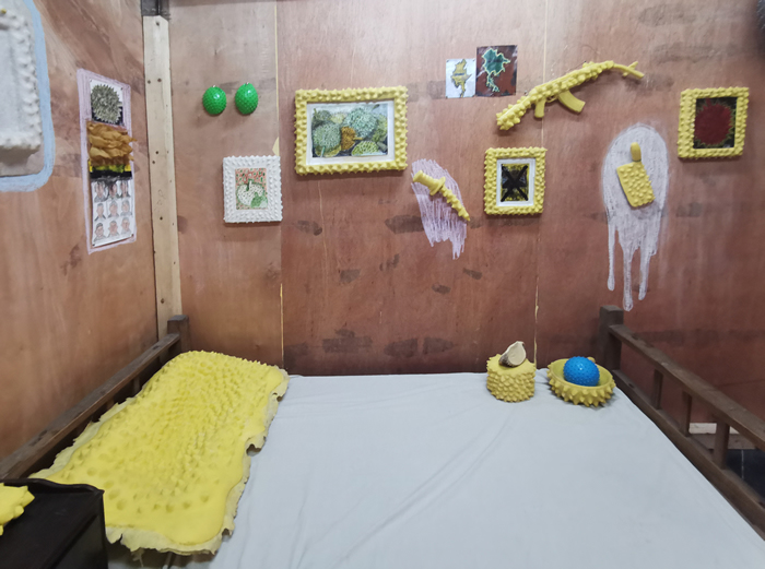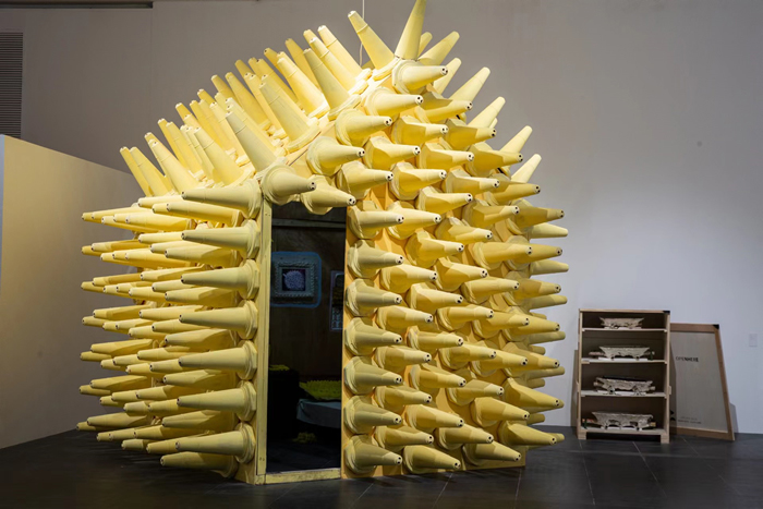 藝術中國:展覽中“榴蓮”的意象很特別,榴蓮是一種中國人非常喜愛的東南亞水果,它的消費和運輸區域也和展覽涉及區域近似,同時席華的“金枕之屋”以安全桶為榴蓮刺,材質又是非常柔軟,內膛又是溫馨的家居,這似乎是對東南亞復雜性的象征化表達,當時策展團隊是怎樣想到以這件作品作為三年展的某種意象表達呢?