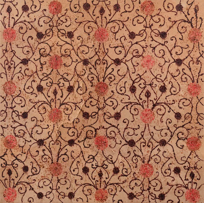 《皮與紋樣-5》,木板上皮革、蠟、銅,180×180cm,2023