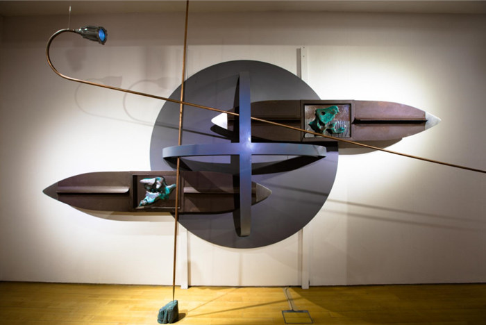 《天際識歸舟》HEAVEN KNOWS THE BOATS,裝置,金屬船兩艘,不銹鋼鏡面,鍛銅太湖石,銅管,尺寸可變,2015—2018年