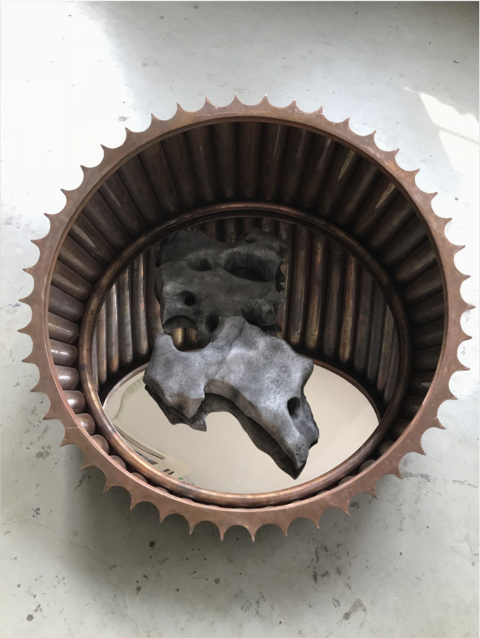 《彌遠之光》A Bright Light Casting Afar,裝置,紫銅管、不銹鋼鏡面、鑄鋁太湖石,2018年