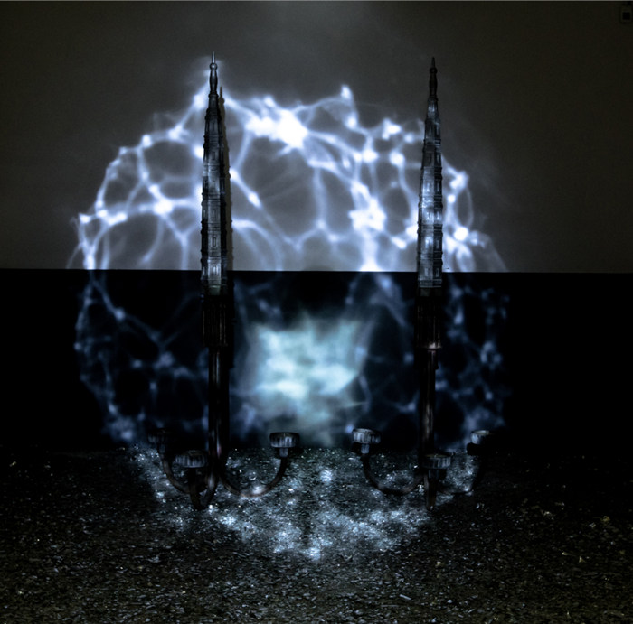 《破曉》DAYBREAK,裝置,燈架、鑄鋁塔、金屬屋、鏡面不銹鋼、電機、瓶膽碎片、白蠟、聚光燈,2016年