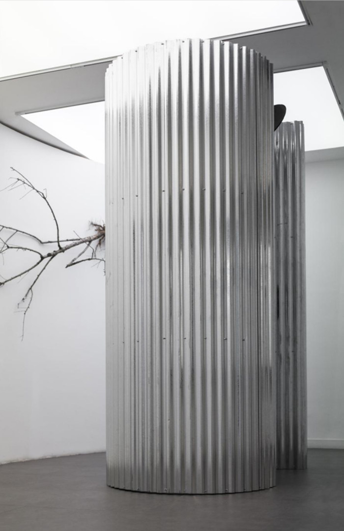 《破風》BREAKING THE WIND,裝置,紫銅管羅馬柱、白鐵板、銅板、不銹鋼凹鏡、低速電機,頻閃燈、喇叭、鑄銅烏鴉、鑄銅太湖石、鑄鋁塔,2018年