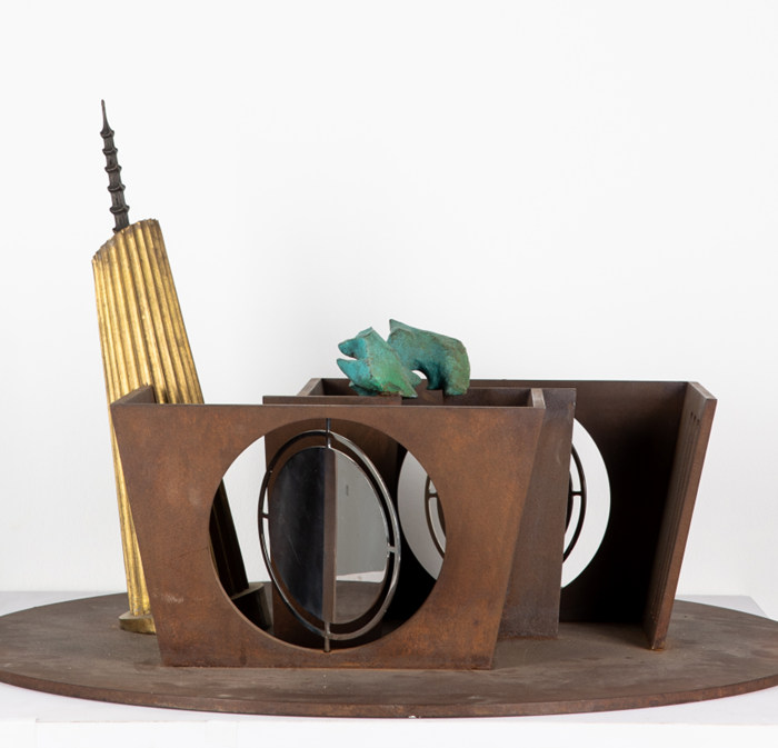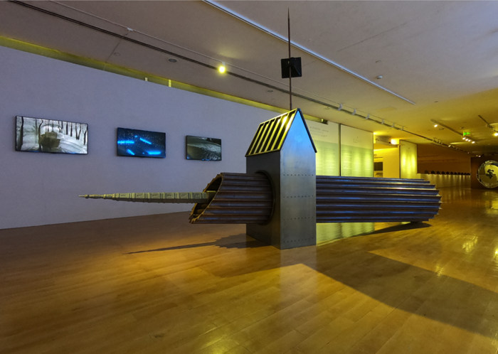 《詩的懸界》Poem of Floating Boundary,裝置,金屬鋼構、部分烤漆、不銹鋼凹鏡、鑄銅太湖石、銅劍、喇叭、黃銅板、六根混凝土立柱雕刻文字(二十四詩品、中英文),2018年
