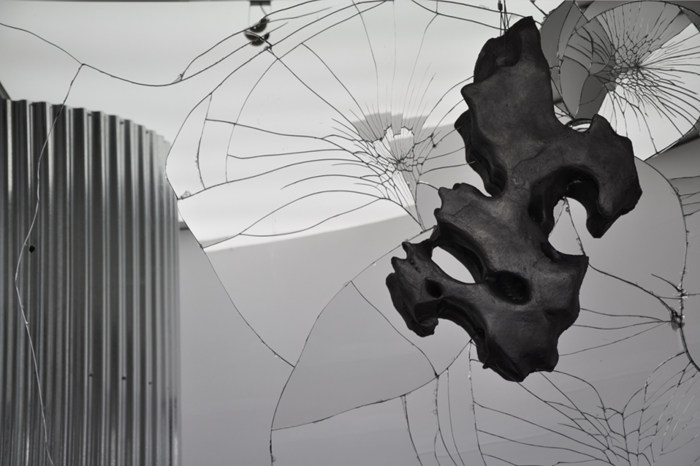 《無人界-融鏡》Sphere without Anybody – Melting Mirror,裝置,玻璃鏡框、鋁鑄太湖石, 2015年