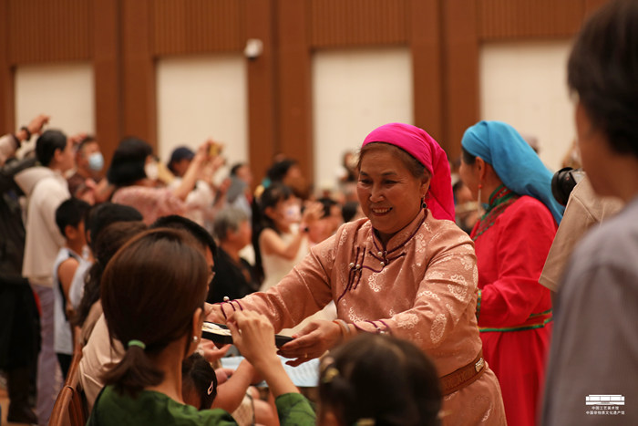 活動尾聲,生活情景劇《草原生活》的展示中,民間藝人們手持日常生活中會用到的器具:奶制品器具、毛氈器具等等,走下舞臺與觀眾互動,呈現出統一的中華民族大家庭的和諧氛圍。