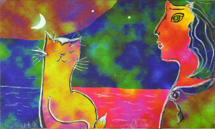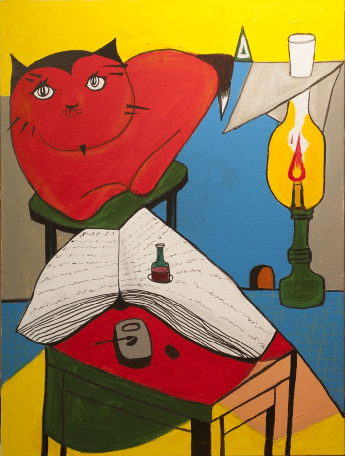 張郎郎曾說:“我的世外桃源和別人不同,一定要有貓”。他畫筆下的貓仿佛也同人一般具有思想,例如他的作品《挑燈夜讀》所描繪的貓在夜晚讀書的場景,張郎郎幽默地調侃到:“看起來此貓很有文化,半夜挑燈讀書,還假裝要寫字。其實它都是為了書里的那瓶酒?!?/p>