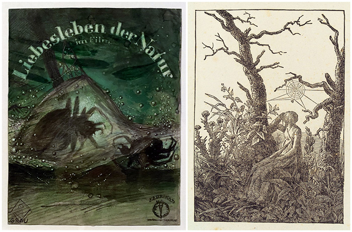 左圖:電影明信片,阿爾賓?格勞;右圖:“蛛網下的憂郁”(Die Melancholie,Die Spinne),大衛?弗里德里希(Caspar David Friedrich,1774-1840),約1801/03,德國法蘭克福施泰德藝術館館藏(St?del Museum)