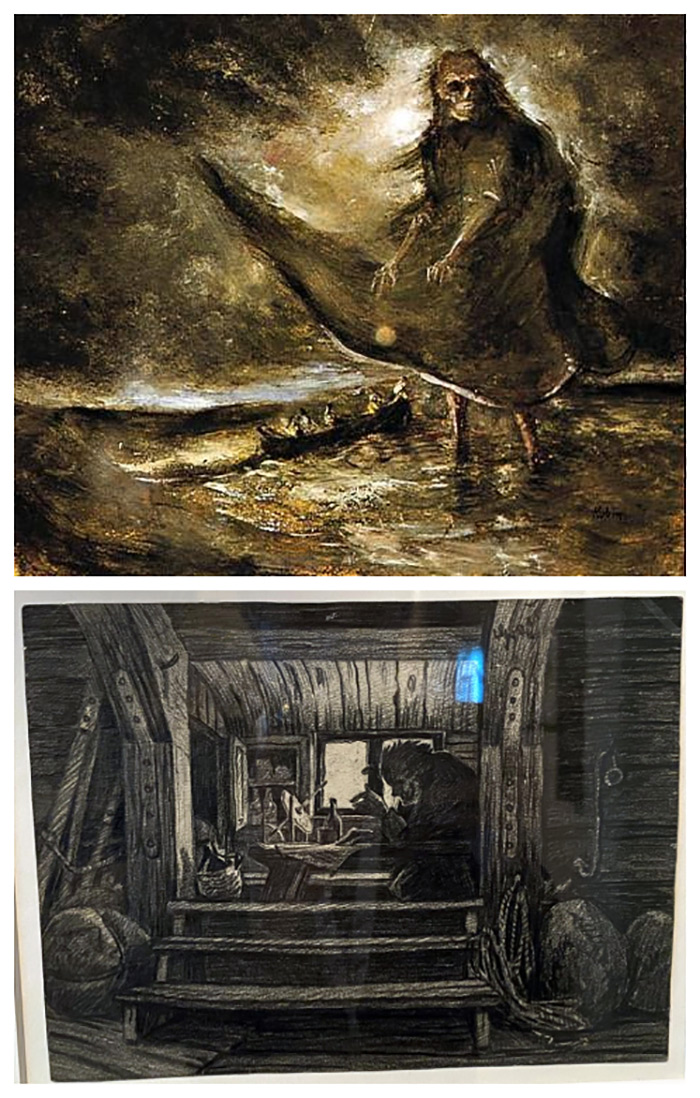 上圖:“海之幽靈”(The Sea Spectre),庫賓,約1905,奧地利薩爾茨堡現代美術館館藏(Museum der Moderne Salzburg);下圖:電影場景設計圖,阿爾賓?格勞,1922