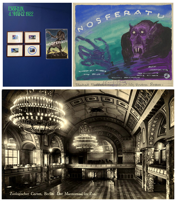 左上:《諾斯費拉圖》電影海報墻;右上:電影海報素描,阿爾賓·格勞(AlbinGrau,1884-1971);下圖:1922年電影在柏林的首映場地