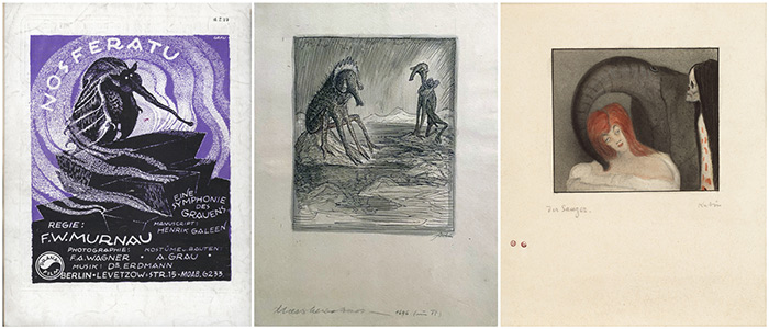 左圖:電影海報,阿爾賓?格勞,1921;中圖:“火星居民”(Inhabitant of Mars),庫賓,1912-1915,維也納阿爾貝蒂娜博物館館藏(ALBERTINA Museum Wien);右圖:“吮吸者”(The Sucker),庫賓,約1903,德國國家博物館之夏夫-格斯騰貝格收藏館館藏