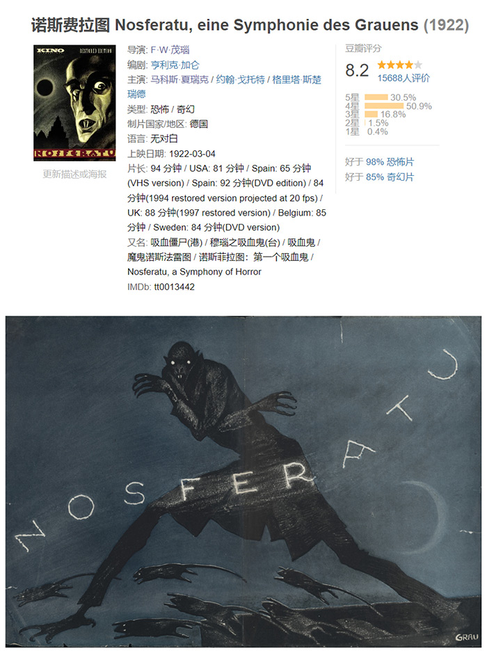 十分cult的是,格勞在投資拍攝《諾斯費拉圖》時并未正式購買小說的改編版權,以致被作家遺孀提起版權訴訟,電影上映的1922年,格勞的電影制片公司就被告到破了產。電影票房也不理想,1924年,法院還下令銷毀《諾斯費拉圖》的所有底片和副本,但并未付諸實施,今天人們才能看到這部與電影《大都會》齊名的劃時代之作。